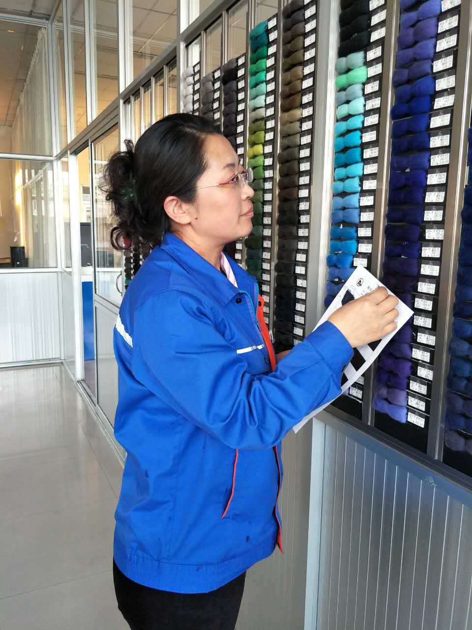 姜艳荣自1998年参加工作,一直从事拼毛打样技术工作,至今已有18年。她合并一二厂拼毛车间统一管理,使之渐入正规。实行意大利模式,提高工作效率,缩短生产周期,拼毛生产周期由7-8次缩短至4-5次。推行备毛加工体系,使库存和备毛得到有效的使用,减少了原料浪费,降低生产成本。更换不合理配方,改进各项牢度,2014年客户陆续反馈含洒脱深蓝R的配方的布样日晒牢度不合格,经过大量实验,将配方更换为洒脱兰2R和黑B,后经过大批试验,最终成品日晒牢度合格,改进日晒牢度,减少质量隐患;2011-2015年连续获得南山纺织服饰技术创新奖。应环保要求,进行活性染料替代媒介染料,每个更换的批次都做记录,跟踪颜色变化,作为原始数据,不断优化配方,保证色光、日晒及各项牢度达到要求。2016年获得烟台市首席技师、全国纺织工业劳动模范称号。