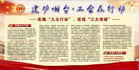 实施九大行动:一是实施“重点工程立功行动”。紧紧围绕全市200多个重点工程、重大项目,深化重点工程立功竞赛活动。通过开展比施工安全、比工程质量、比建设工期、比技术创新、比科学管理,创精品工程的“五比一创”立功竞赛,确保重点工程优质高效推进。在重点工程立功竞赛中发现和培育先模人物、先进典型。对成绩突出的单位和个人授予烟台市“五一劳动奖状(章)”,以实际行动为推动烟台跨越发展助力添彩。