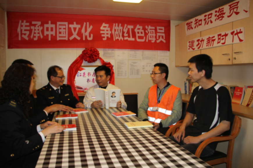 为加强海员思想建设,提高海员政治意识,争做“知识海员”、“红色海员”,烟台国际海员俱乐部针对海员常年漂泊在海上,信息不通、知识不足的现实问题,联合烟台边防检查站、中国烟台外轮代理有限公司等单位积极建设海上“红色书屋”,为海员建立党建知识学习园地,并设立专人管理,定期组织海员集体学习党的路线、方针、政策,教育引导广大海员坚定不移听党话、跟党走。
