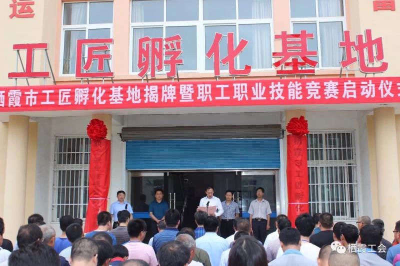7月10日,由栖霞市总工会牵头举行的“工匠孵化基地” “职工职业技能竞赛实训基地“启动仪式在烟台风能电力学校举行。市委副书记李冬出席仪式讲话,并揭牌。栖霞市委宣传部、总工会、人社局、科技局、教体局、经信局、安监局主要负责人,各镇、街道、开发区专职副书记、工会副主席,市直有关单位工会主席,技能竞赛参赛选手、风电学校师生代表,共计240余人参加了仪式。