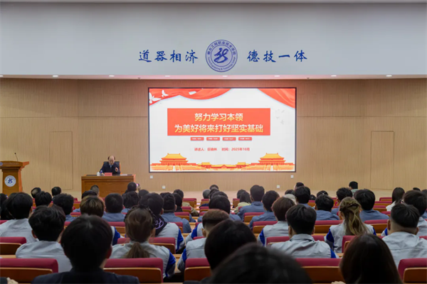 随后,在烟台工程职业技术学院召开“劳模精神、劳动精神、工匠精神”主题宣讲报告会,巨晓林以《努力学习本领,为美好未来打好坚实基础》为题,用朴实真挚的语言分享了自己从普通农民工成长为全国劳模的奋斗历程。他围绕忠诚、实干、创新、奉献四个维度,讲述了三十载坚守铁路电气化岗位、追求精益求精的职业故事,激励学院师生以劳模工匠为榜样,练就过硬本领,在平凡岗位上创造不平凡业绩。