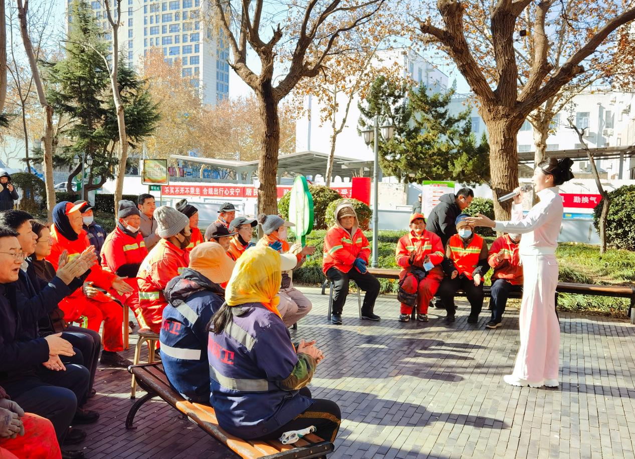 上午,在潍城区工会驿站前,环卫工人们围坐成圈,观看全总文工团演员们带来的精彩节目,生动的表演让现场笑声连连、掌声不断。演员们与环卫工人现场互动,让常年坚守户外的环卫工人们感到了惊喜和浓浓的暖意。
