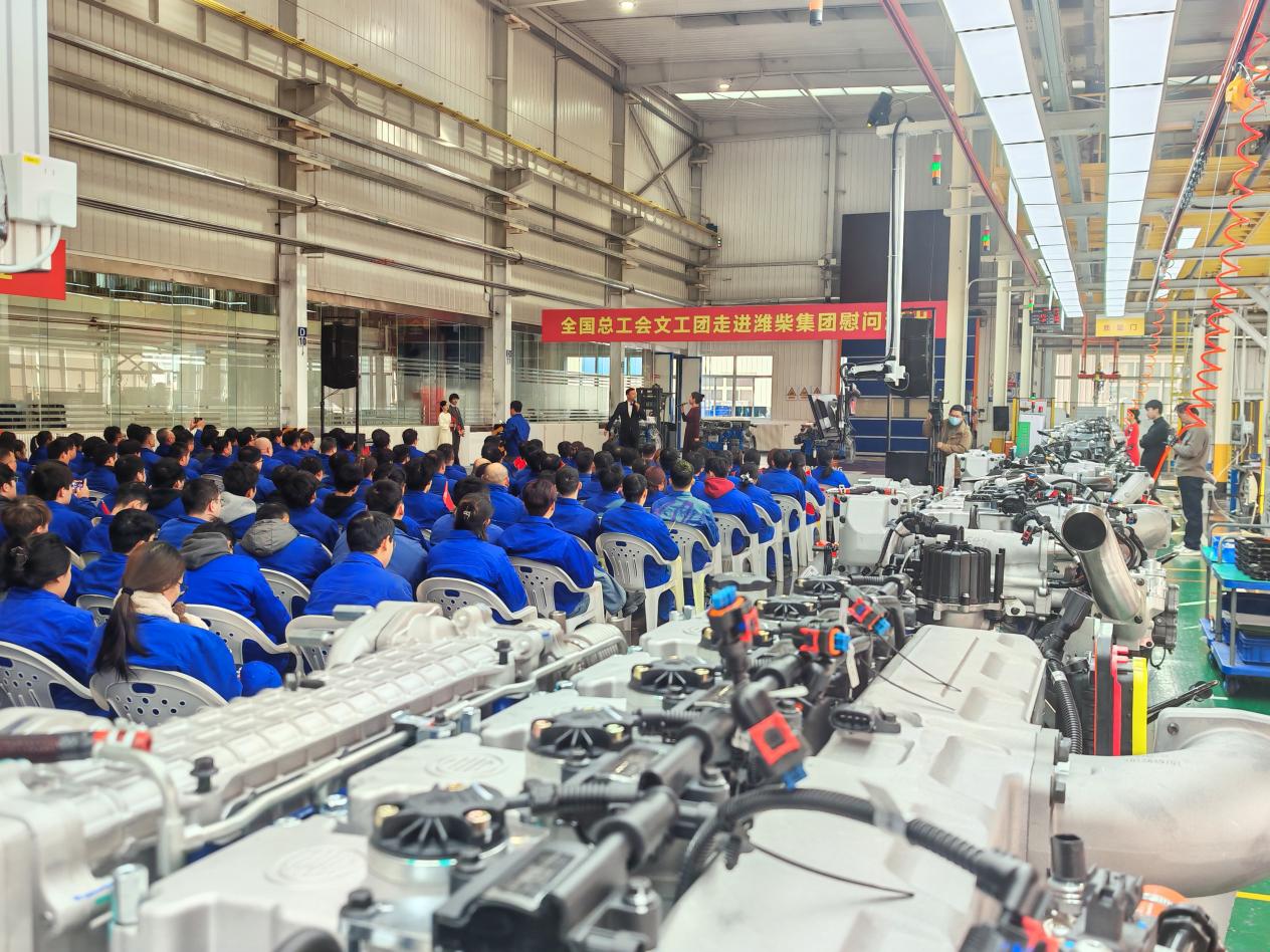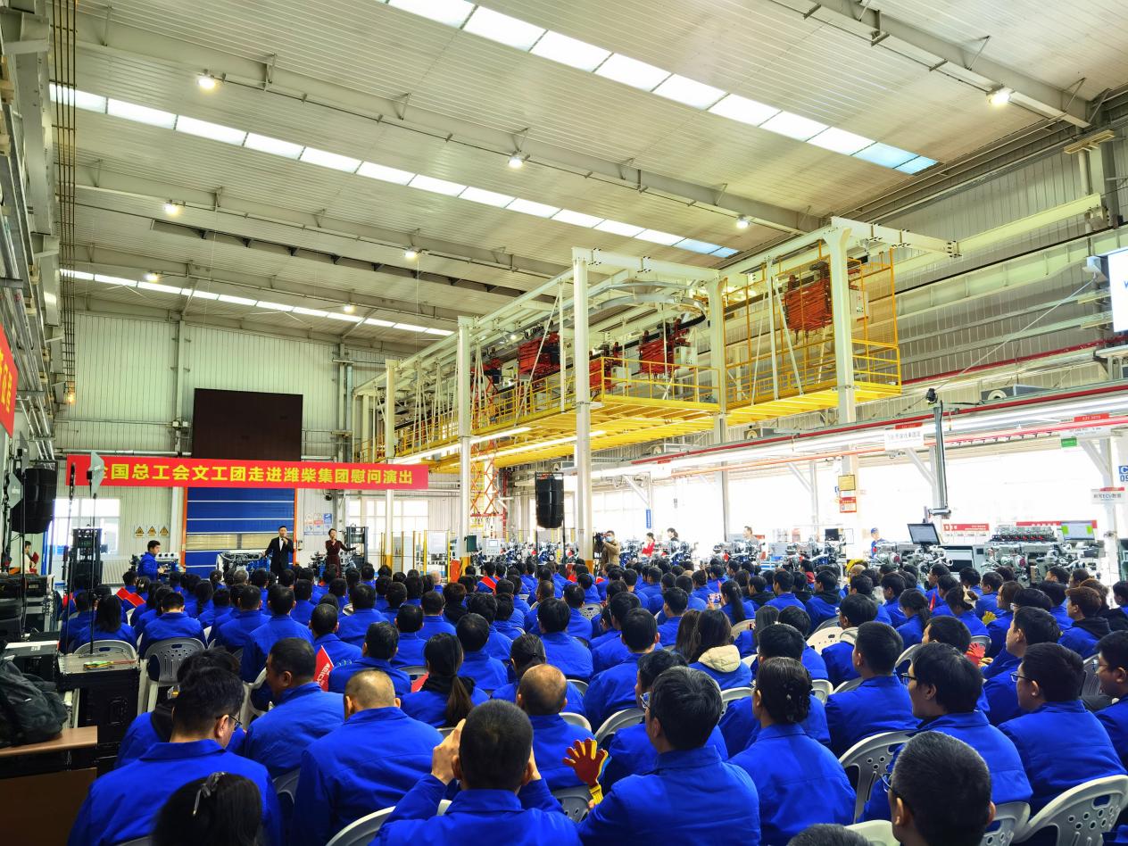 下午和晚上,演员们在潍柴动力燃气动力公司生产线、潍柴分厂3号车间里,分别开展慰问演出,1500余名一线职工现场观看了演出。演出在歌曲《劳动畅想曲》中拉开帷幕,朗诵《劳动者最美》引发在场职工强烈共鸣,歌舞《奋斗进行曲》将气氛推向高潮。2025年大国工匠、潍柴职工汤海威说,“在车间里看到国家级文艺院团这么优秀的节目,我和同事们都非常激动、感动,感谢全国总工会文工团和潍坊市总工会。这份温暖与鼓舞让我们干劲更足了,今后我们将更加努力工作,创造更好的成绩。”