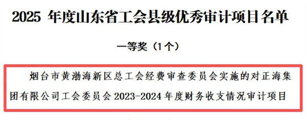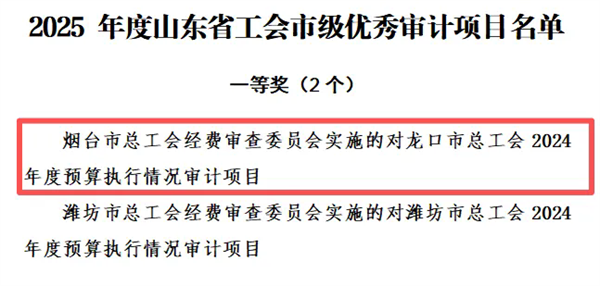 市级层面,烟台市总工会经费审查委员会实施的对龙口市总工会2024年度预算执行情况审计项目荣获“山东省工会市级优秀审计项目一等奖”;县级层面,烟台市黄渤海新区总工会经费审查委员会实施的对正海集团有限公司工会委员会2023-2024年度财务收支情况审计项目荣获“山东省工会县级优秀审计项目一等奖”,为全省县级项目中唯一获此殊荣的单位。