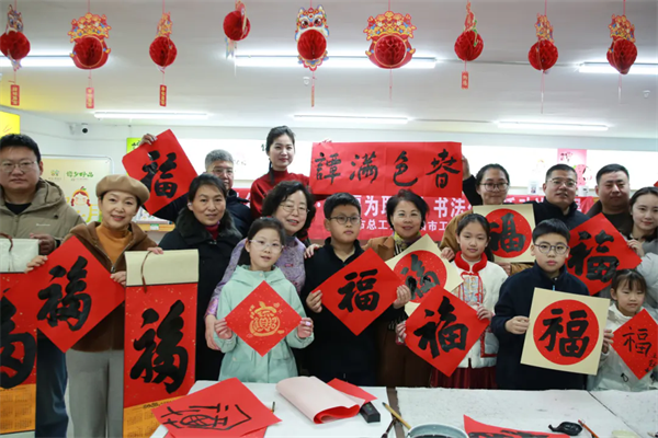 1月31日,莱阳市总工会、谭格庄镇总工会走进谭乡好品开展“迎新春·写福字”亲子雅聚活动。莱阳市工人文化宫书法培训的老师和学员们纷纷提笔,现场书写福字、春联,为50余名职工家庭送上新春祝福。