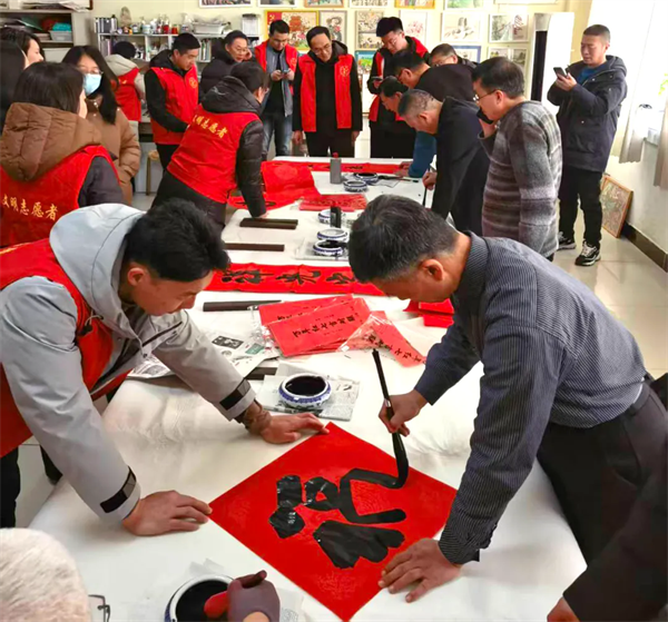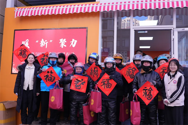 高新区总工会在中海金街商圈工会驿站开展“暖‘新’聚力 ‘福’气加持”活动,邀请山东省书法协会会员挥毫送福,为近100名外卖骑手及社区群众送上对联、福字。